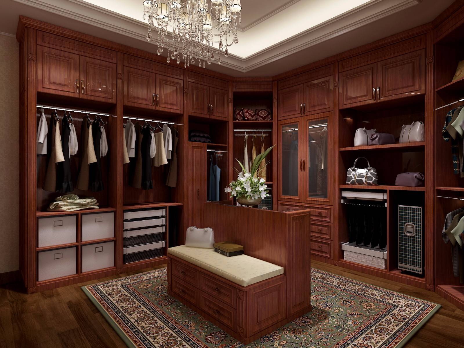 放置在衣帽间内的衣柜需要更加专业的布局设计,需配有放置专区用来存放配件、鞋履、衣物等。可以设置不同大小的用来储存物品的收纳盒在衣柜最上方,并在衣柜中间内嵌梳妆台,还可以在梳妆台旁边设置尺寸不同的隔层。这种衣柜一般都比较大,占据了衣帽间大部分的空间。